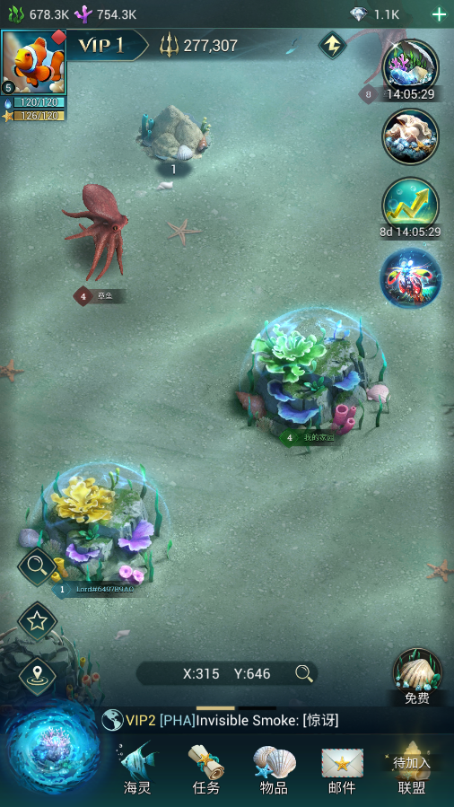 首先在画面风格上,舞台似乎是位于比较明亮的浅海珊瑚礁区域,游戏内的功能性建筑大多是各种各样的珊瑚和水生植物群落,整体给人的感觉比较温暖和悠闲,有别于深海给人留下的神秘危险的印象。