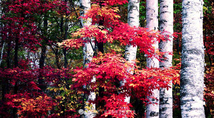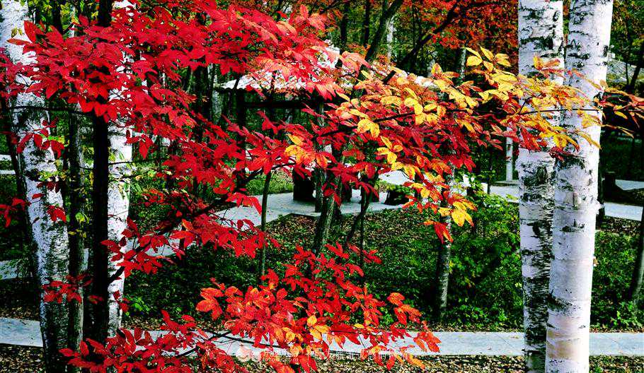 片片红叶在微风中仿佛感知秋意的渐近,悄悄地退去绿色,摇身灿烂的浴火燃烧。这好似涅槃的燃烧,在宁静密林中悄然的升华着枫叶一生的绚烂,在秋意的微寒里,这片清幽的山林层林尽染,那白色的桦树,墨绿的青松,还有那红黄交织的枫叶。