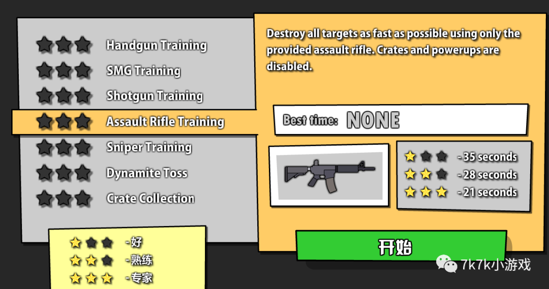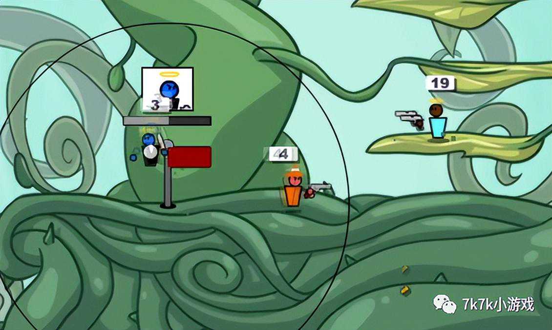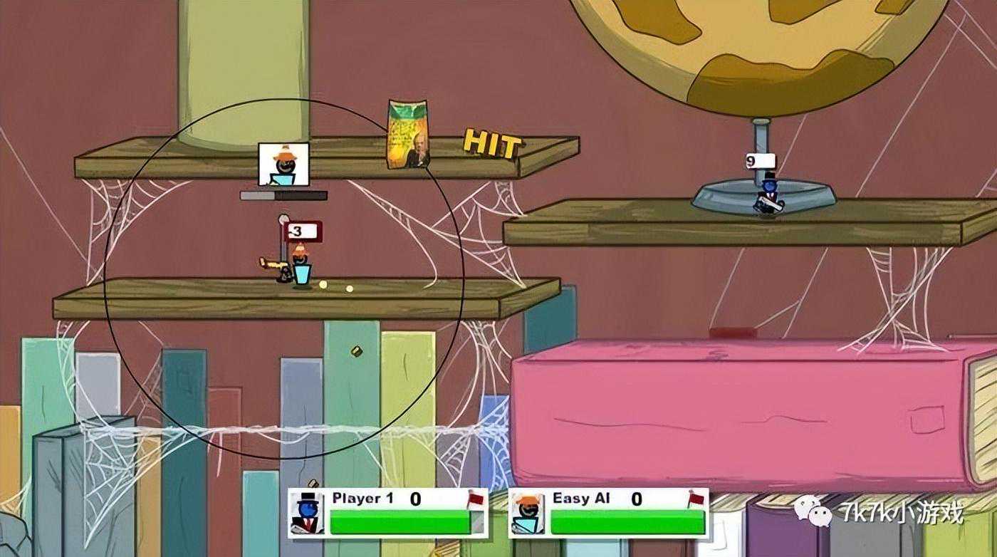 第一关是教学关,用手枪把敌人打飞场地外即可获得胜利,随后会获得新的武器,冲锋枪和狙击枪;第二关同样非常简单,通过后解锁散弹枪和步枪,第三关需要把对手打出场外15次;后面每一关都会解锁部分枪支,第十关就是该版本的最终boss,手持不换弹的加特林,当打败他后混乱大枪战第一部就全部通关完成了,当然还有自定义模式,可以让多名玩家们共同玩耍。