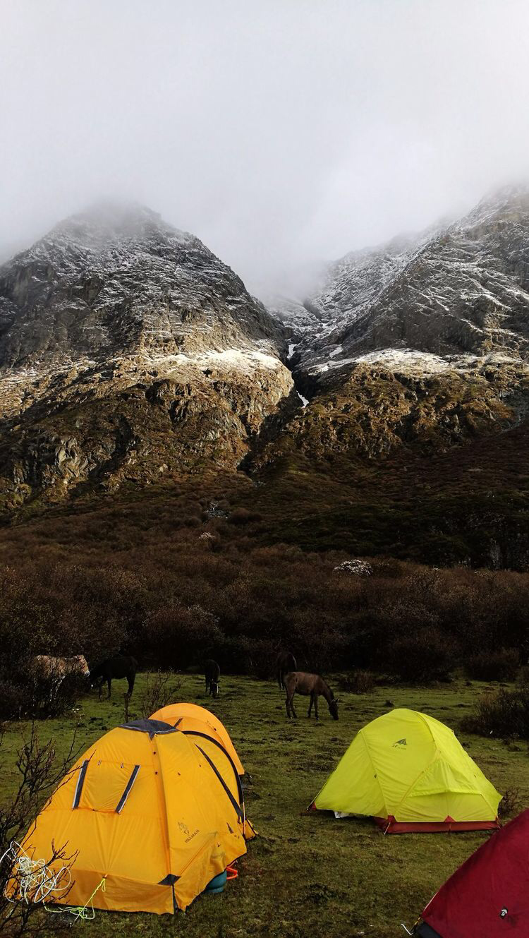 5.27.浑身湿冷躺在避风的帐篷里,喝着热咖啡,听雨滴噼噼啪啪敲打。回忆跨越回到早上。帐篷前的仰视90度的峭壁被薄雾笼罩,洗漱早饭,打包拔营,初始几个小时顺利,后来阴雨连绵,湿冷异常,雨披雨衣抵挡住雨水,但丝毫抵御不了寒冷。披荆斩棘,低头一味走路,队伍分散成几只,终于抵达营地。抓紧时间雨中扎营。雨水忽然变成了冰雹,淋漓敲打在绿色的草地上,撒满了白色的点点花朵。几组前面撤下来人路过,精神萎顿,有一男一女严重高反,呼吸困难,走路艰难,另外一队的人说翻过垭口遇到几年不遇的大雪,马匹根本通过不了。还拍了照片让我们看气候的恶劣。情况的严重。一致决定先扎营再说。这个营地只有浅浅十几公分的水洼作为饮用水。雨中四个人负责拉雨披遮挡雨水,下面炒菜做饭。马夫们安顿马匹,砍树烧篝火,一群人围着火堆聊天,寒暄。扎西唱起那动情的康巴情歌,大家举杯而和,欢笑洋溢在每一个人的脸上。一碗热乎乎的东北大烩菜,各种蔬菜,肉罐头掺合在一起,煮熟之后那香气已经让人有把那口锅端起来一饮而尽的想法。身体暖和了,在大珠小珠落玉盘的雨水敲打帐篷的音乐中幸福的睡去