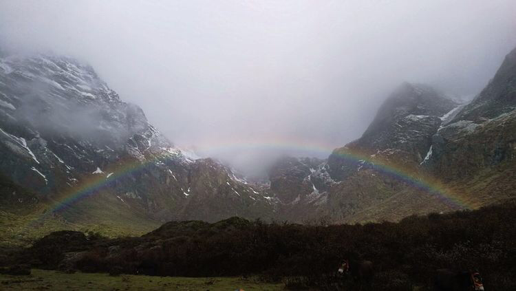 5.26第一天徒步。几个强驴留下照顾马帮托运行李。其余的队友先走,五个人等待两个小时才来的马队,藏族人似乎对时间观念永远滞后。对讲机里听得前队的迷路,误入一个月前独身徒步去世的女驴友金盼盼的途径,六十度的碎石坡,下面小悬崖,幸好及时发现,迷途知返,安全回归,惊险。我们追随马帮,轻松惬意的漫步。惊艳神仙洞,参天古树,怕人的羊肠山路旁垂直的悬崖。高耸令人高山仰止的直立山壁,应该只有鸟儿能飞过去。。七匹马的驮队,马儿吃着草散着步,托着两个大包,就轻松超越我们,露营开锅做饭,洗菜的,炒菜的,刷锅的,各负其责。高山细雨中能吃到一顿热乎乎的饭菜真是幸福极了