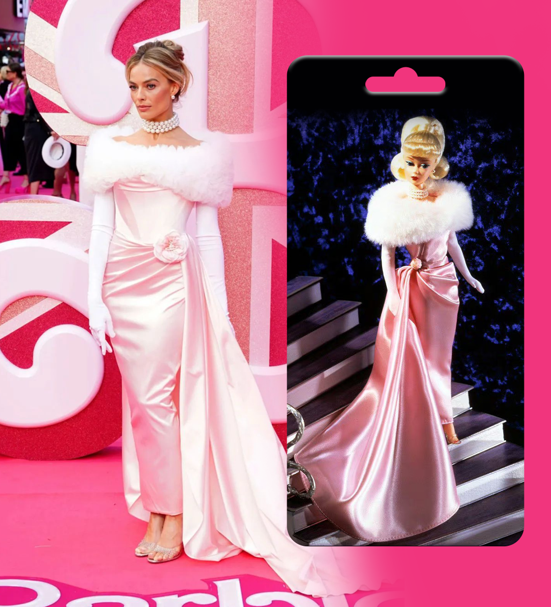 复刻了1960年推出的迷醉夜幕芭比,粉色缎面长裙搭配3层超大珍珠项链,优雅又复古。