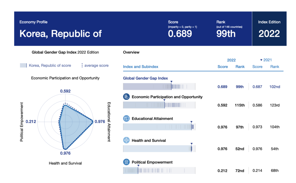 2022年《全球性别差距报告》:韩国在146个国家中排名第99位