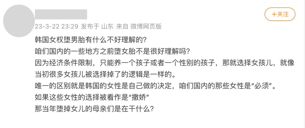 也有人提出“堕男胎”传播过程中的bug:如果一位极端女权人士真的厌男,那么大概率也不会选择婚育,更不会走到堕胎这一步。