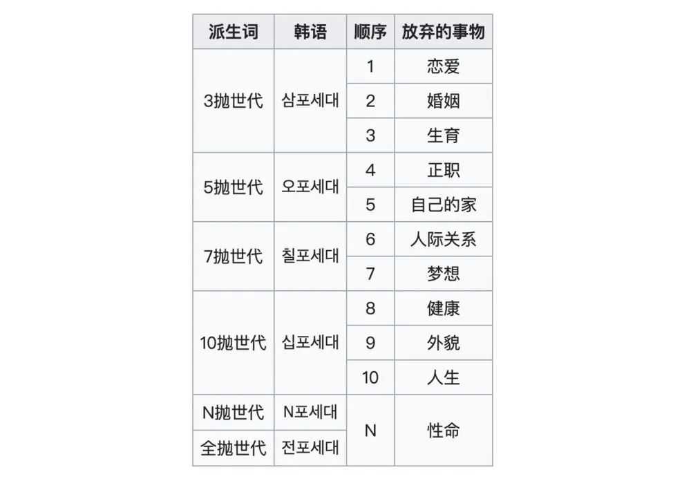 韩国男性在2011年左右提出了“三抛”主义:贯彻“不恋爱、不结婚、不生育”的方针。如今已经进化到了“五抛”“七抛”,实在活不下去了就不活了。