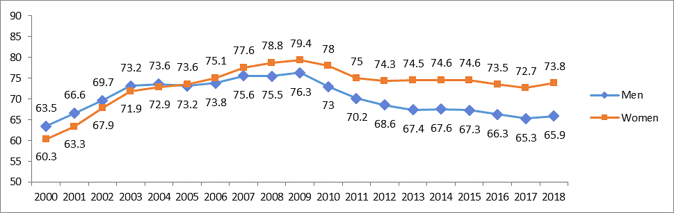 韩国经济腾飞后,女性受教育程度一路上升,甚至逐渐赶超男性。2020年,女性的高等教育入学率为71.3%,比男性高出5%。