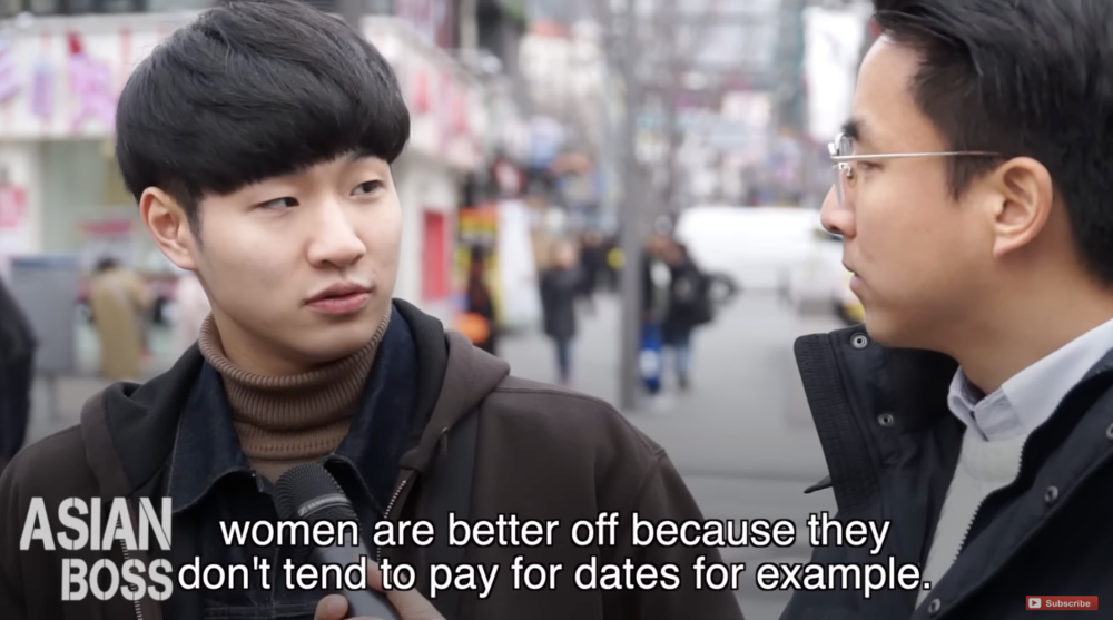 年轻男性认为韩国早就实现了性别平等,而女性仍然作为社会中的“弱者”享有不公平的保护,有点“蹬鼻子上脸”的意思。在AsianBoss的街头采访中,众多年轻男性认为,女性专属车厢、女性专属停车位、以及女性免服兵役,都是她们享有的特权。