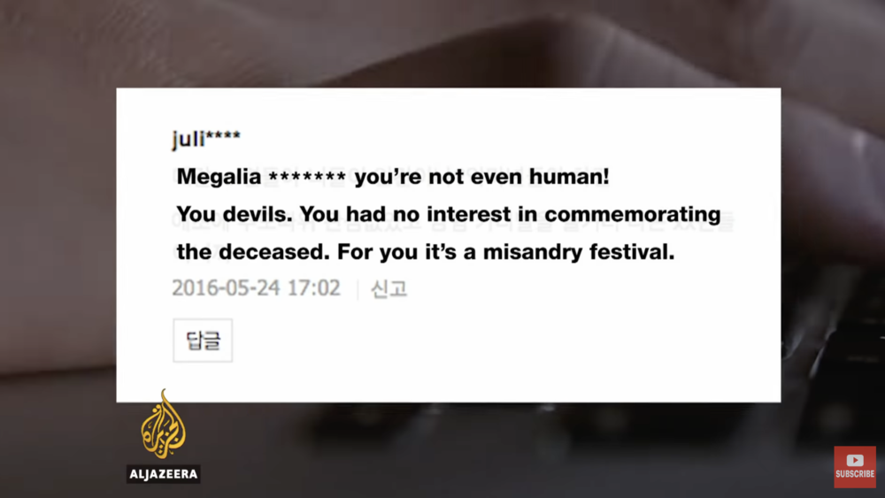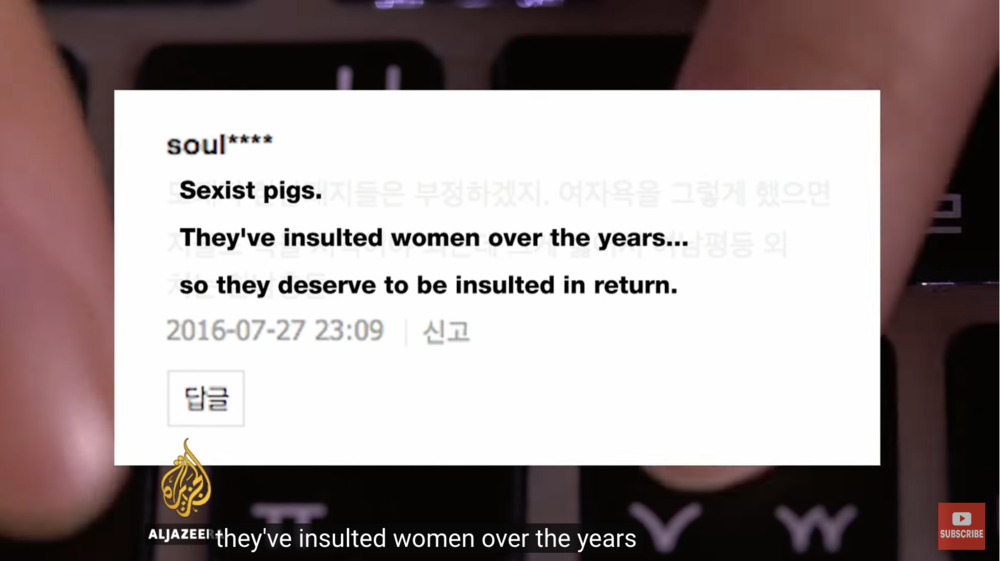 韩国最活跃的反女权组织之一“男人团结”(ManonSolidarity)的负责人表示:“我们不仇恨女性,我们也不反对提升她们的权利,但女权主义者是一种社会罪恶。”