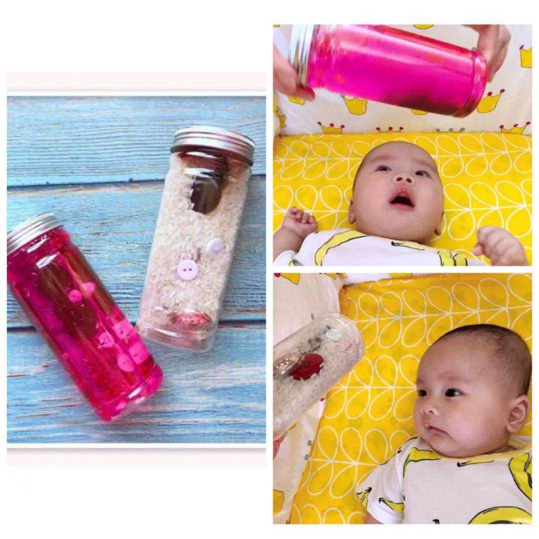 游戏玩法:收集2-3个空瓶子,任意挑选制作其中一款视觉瓶子。第一款视觉瓶子是米粒+纽扣组合;第二款视觉瓶是水+豆豆组合;第三款是水油+塑料球组合。当我们移动瓶子时,宝宝的目光会跟着视觉瓶移动,瓶里物质的流动也会吸引宝宝目光。