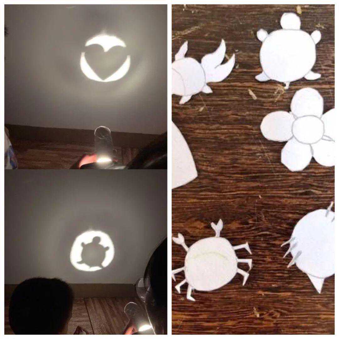 游戏玩法:首先用卡纸剪好各种投射的形状轮廓,并用保鲜膜裹住纸筒一端。然后关灯并把粘卡纸的一端对着白墙,打开手电筒对着没裹保鲜膜的一端照射,图案光影就会呈现在白墙上。