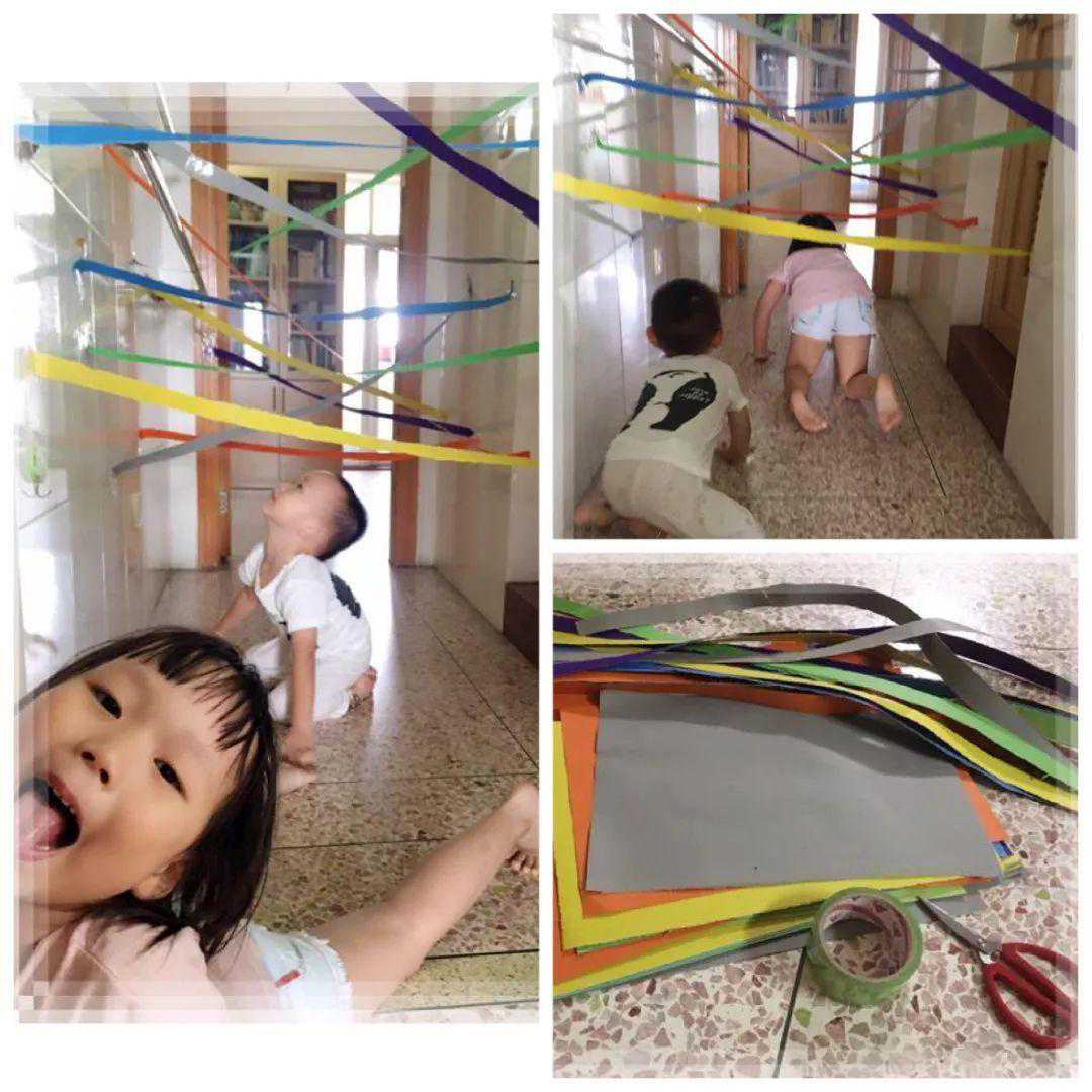 游戏玩法:将彩色纸条两头贴在过道两侧,形成高低不同的路障,不碰触纸条顺利穿过过道的宝宝就是赢家啦!如果宝宝年龄偏小,可适当加宽彩纸条的间距。