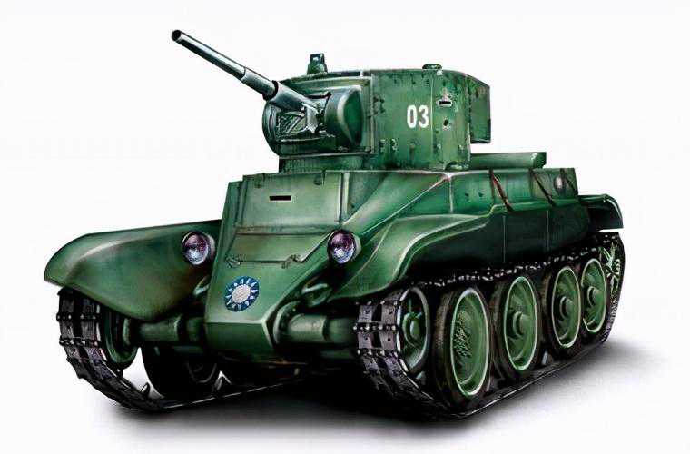 苏联BT-5轻型快速坦克(BT-5BystrochodnijTankov)。苏联的BT系列“快速坦克”诞生于20世纪30年代早期,以美国克里斯蒂轻型坦克为蓝本,采用了美国的悬挂系统和引擎,根据苏联军队要求改进设计。首款是装备37mm炮的BT-2,1933年推出装备45毫米主炮和同轴7.62毫米DT机枪的BT-5,改进型就是最出色的快速坦克BT-7,而BT-7发展出了大名鼎鼎的T-34中型坦克,被认为是二战最好的坦克。