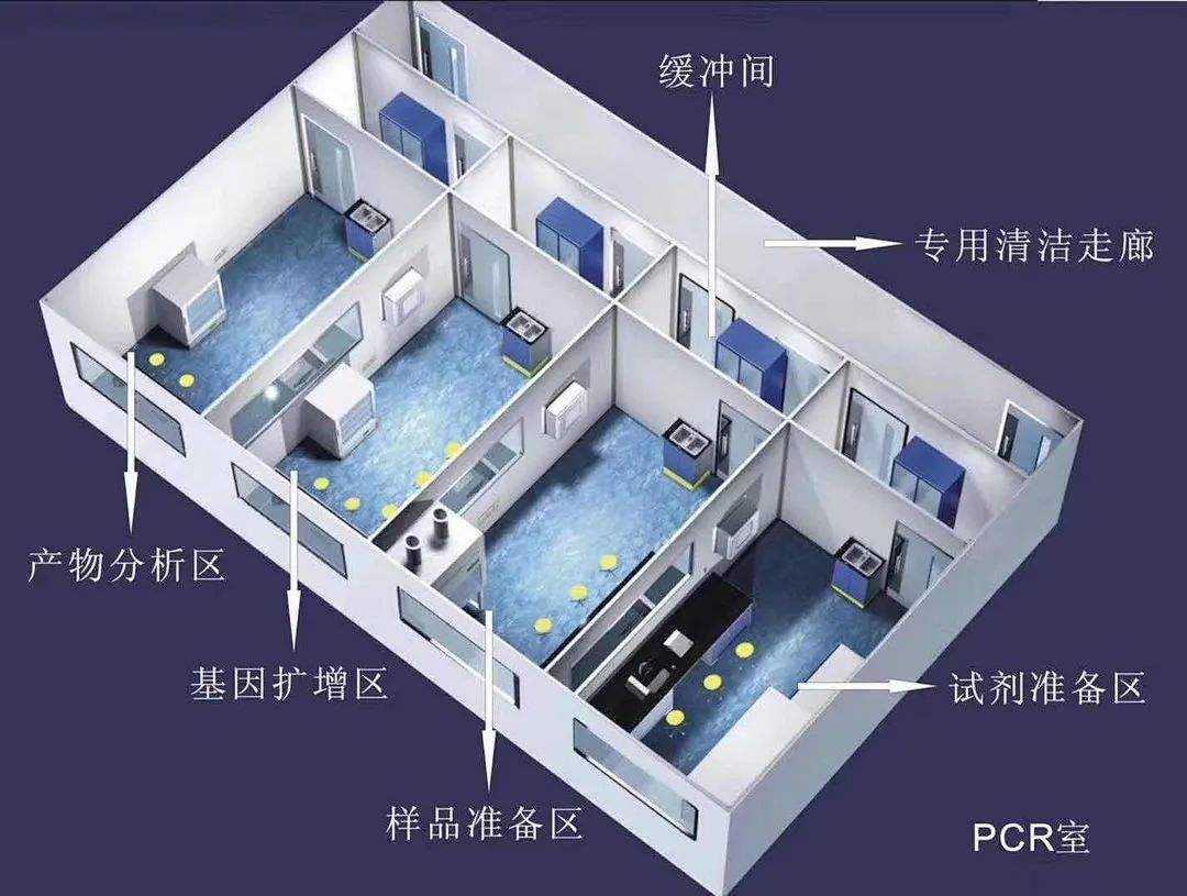 基因扩增实验室的设计通常有四大分区:试剂贮存和准备区、标本制备区、核酸扩增区、产物分析区。这四个分区原本就不需要连接在一起,且在物理空间上必须是完全独立的,各区域无论在空间上还是在使用中,应处于完全的分隔状态,不能有空气的直接相通。各试验区的试剂及样本传递必须通过传递窗进行,进入各个工作区域必须严格遵循单一方向进行,即只能从试剂贮存和准备区→标本制备区→扩增反应混合物配制和扩增区→扩增产物分析区。