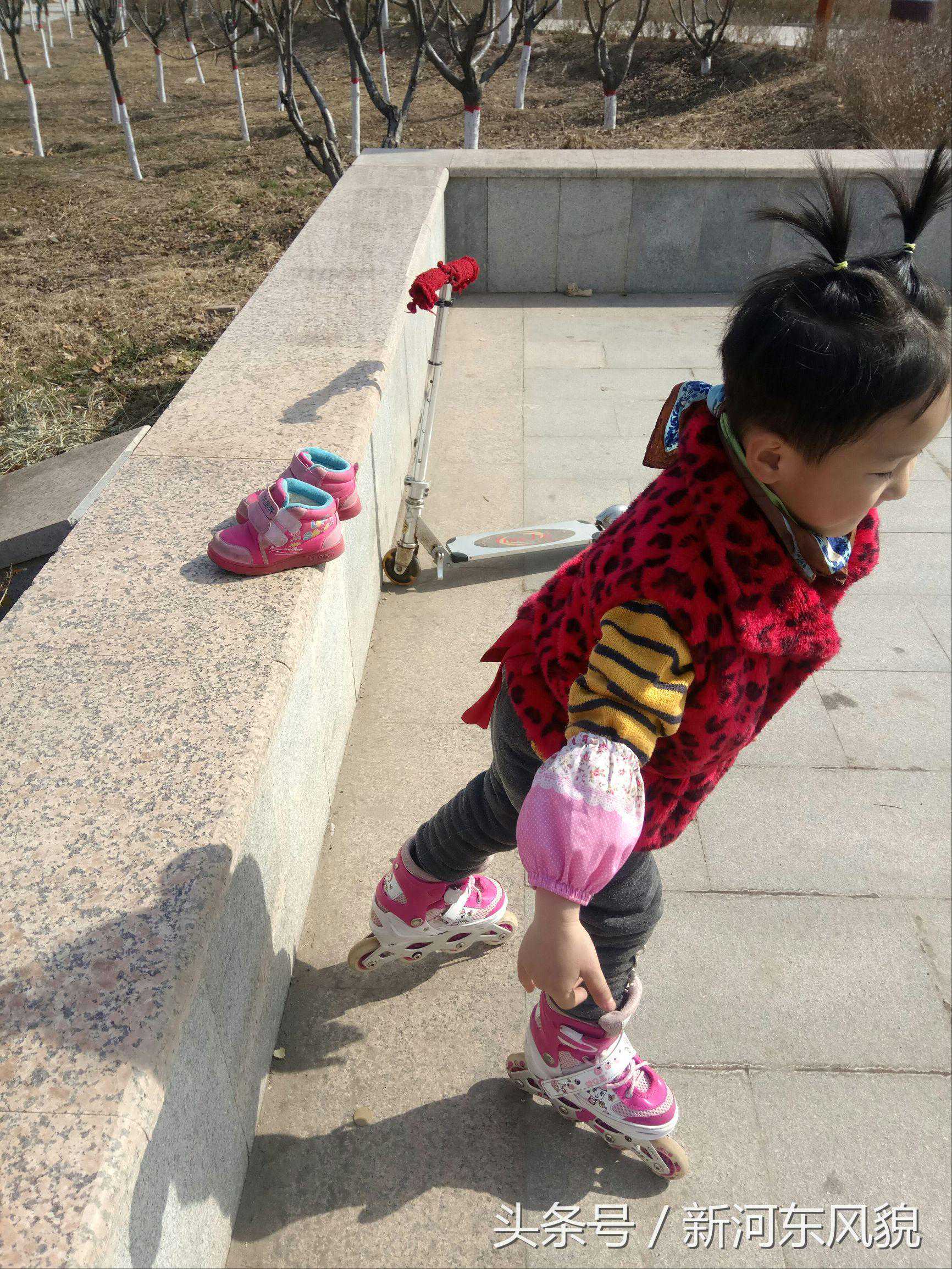 到光的路面后,小孙女又开始出发滑旱冰了。