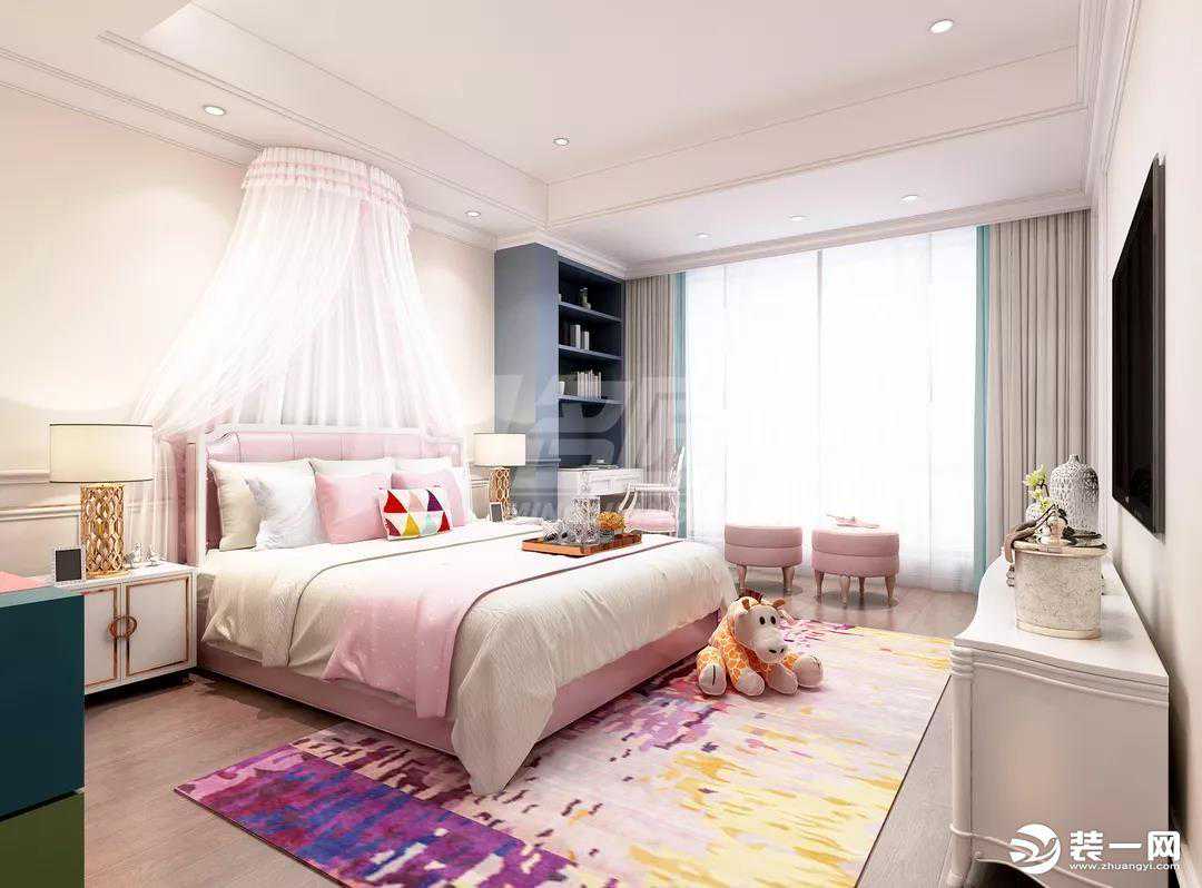公主房粉嫩无比,充满实用性,健康环保的木地板搭配色彩鲜艳的地毯,以及憨厚的毛绒玩具,温和柔美的视觉营造让孩子感到特别安心的成长环境。