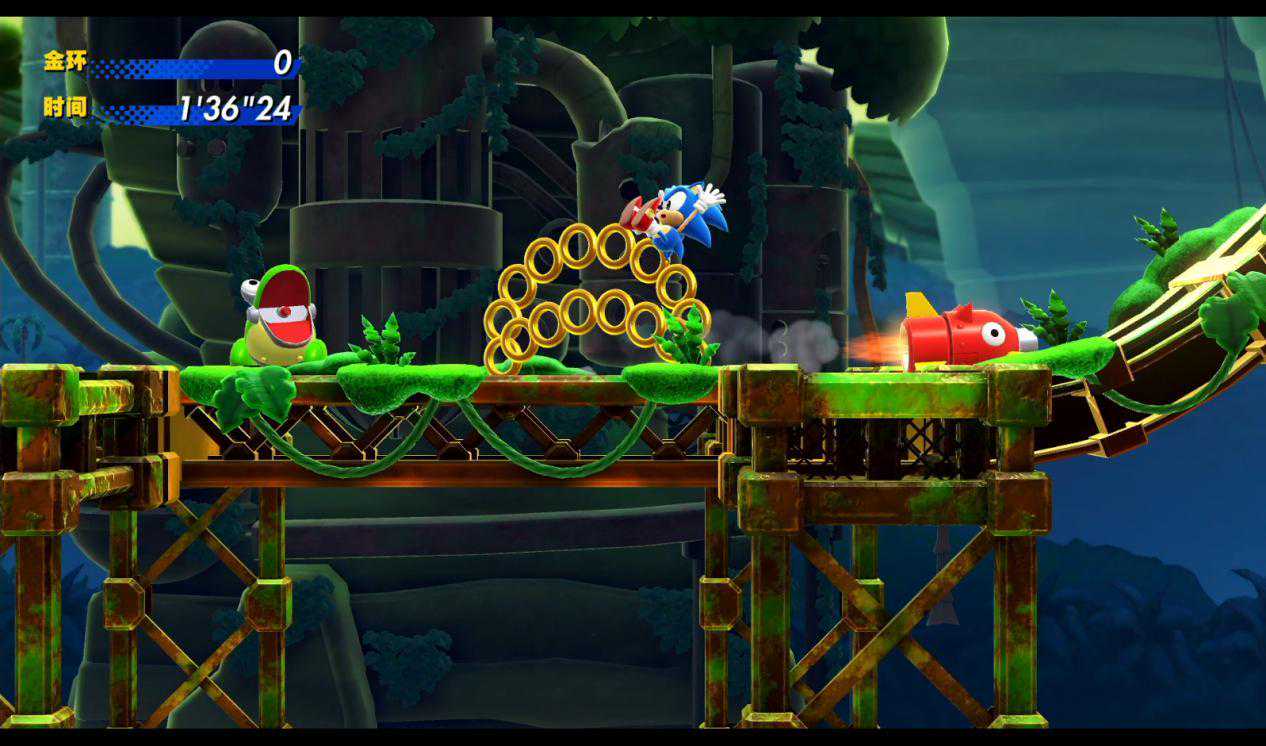 而放在《索尼克:超级巨星》里,玩家其实打一开始就拥有了解开所有路线所需的能力——击破敌人和障碍需要的弹跳,快速穿过环形赛道所需要的加速力,飞跃平台所使用的真实惯性等,这些难以被其他游戏所复制的要素所服务的,其实正是游戏中丰富的章节主题与场景装置,也只有在掌握和彻底理解了这之中的因果关系后,玩家才能体会到“2D索尼克”游戏真正的魅力。