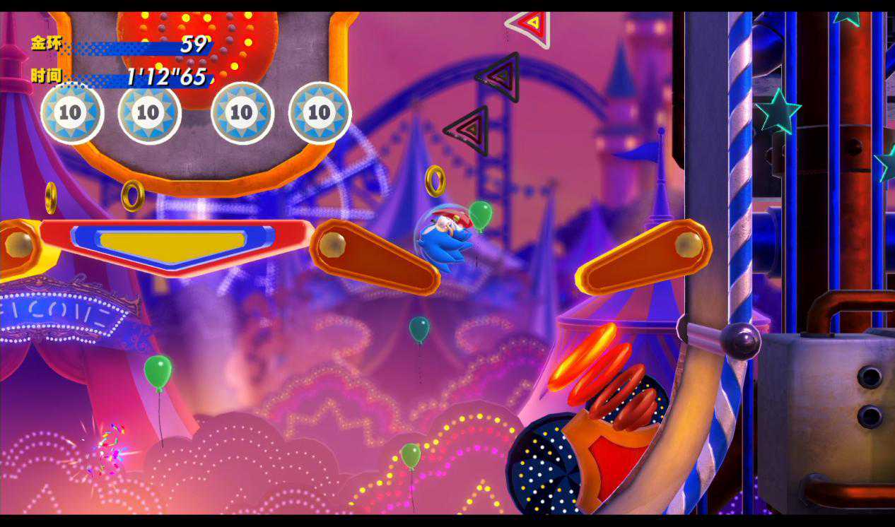 比如,在《索尼克:超级巨星》的第四章中,制作组就专门搭建了这么一个以“弹珠台”为主题的游乐园关卡,从转盘到弹球器再到记分牌,场景中塞满了铺天盖地的弹珠台要素,利用索尼克会变成“球状”滚动的基础特性,既让玩家享受到了不同于其他关卡主题的乐趣,又致敬了曾经发售在MegaDrive上的经典游戏《索尼克弹珠台》——更不用提这些要素最终也同样会被运用到关底的BOSS战中了。