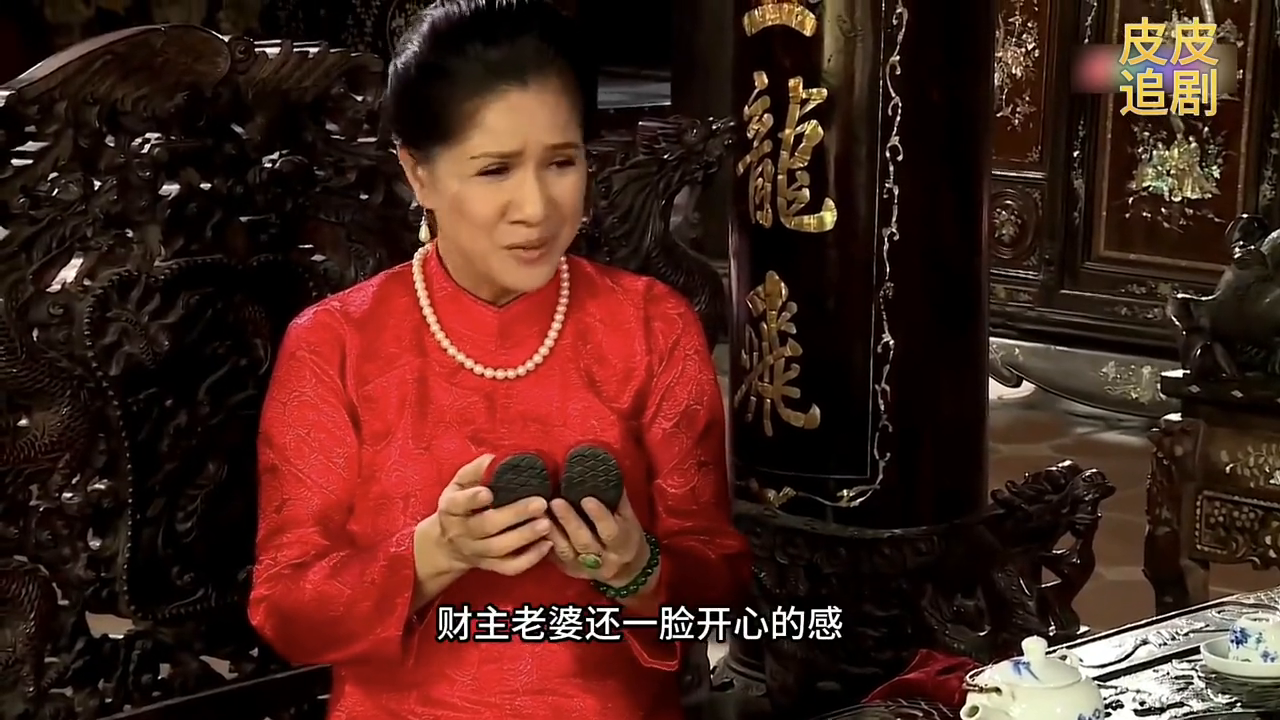 第二天,财主来到老人家中,邀请他们参加他儿子的百日宴。老人表面上答应了,但实际上心中却想着如何处理这些黄金。其他亲戚都送了贵重的礼物,而老人只送了一双自己做的小红鞋。财主的妻子很开心地接受了老人的礼物。但当老人的儿子玩耍时,忘记把鞋子拿出来,小狗把鞋子叼走了。
