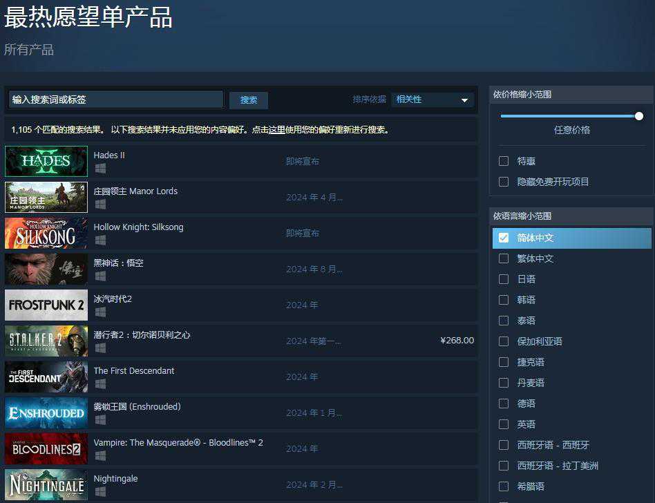 值得一提的是,《黑神话:悟空》已在Steam最热愿望单排行榜中升至第4名,超过了《方舟2》《潜行者2》等,位居《哈迪斯2》《庄园领主》《空洞骑士:丝之歌》之后。