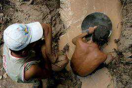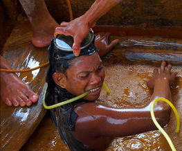 金矿的矿脉有很大一部分埋在水下,这就需要矿工深入数米深的河中,在黑暗里摸索前进,来到空气浑浊的洞穴。