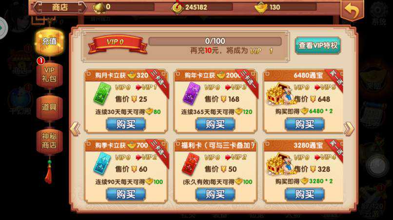 除此之外,《天天有喜》还为各位设置了月卡、季卡、年卡和福利卡四种特殊充值方式。一张月卡的价格为25元,购买后可立即获得320个元宝,另外连续30天每天都可领取80元宝;季卡的价格为60元,购买后立即到账700元宝,连续90天每天可领取100元宝;年卡的优惠力度更大,花费168元可立即到账2000元宝,另外连续一年每天都可领取120元宝。但是,需要特殊说明一下,月卡、季卡、年卡这三种卡只能同时拥有一个,玩家一定要根据实际需求来选择购买。如果玩家还嫌不够过瘾,那么完全可以再购买一张福利卡,福利卡价格为50元,永久有效,购买后便可每日领取100元宝,而且是可以和其他的三种卡叠加使用的哦。
