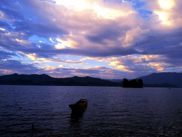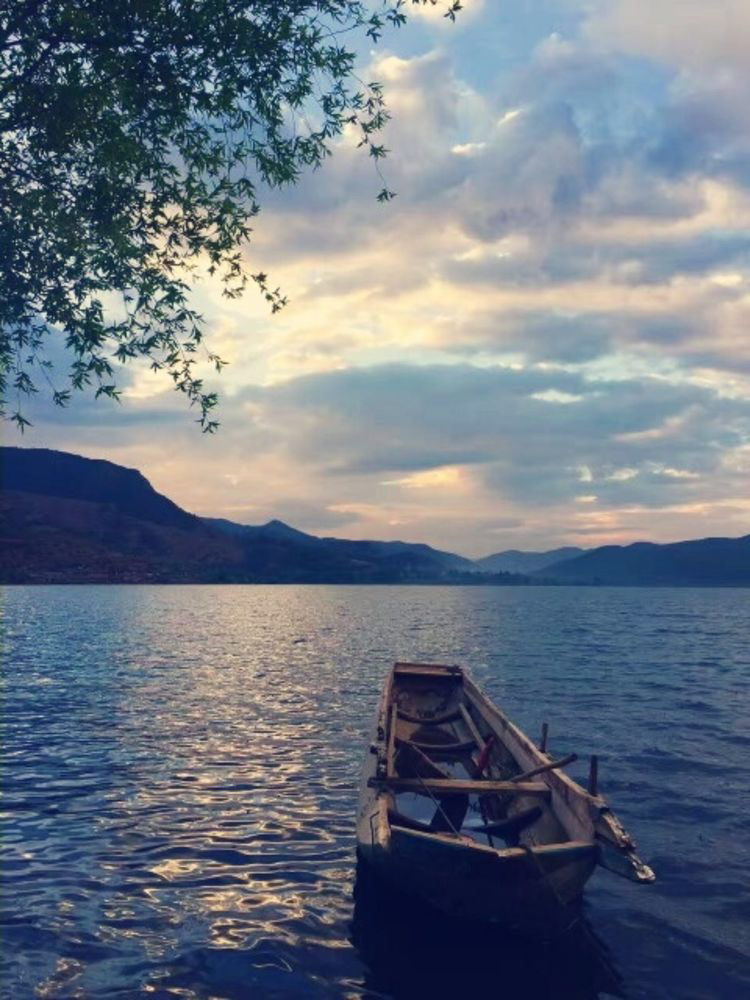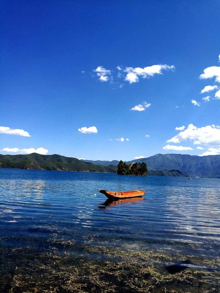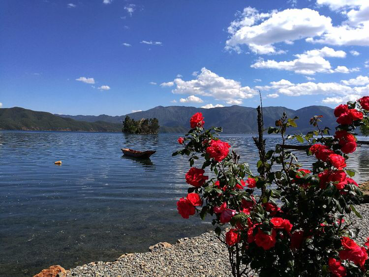 5.23泸沽湖第二天。洁白柔软的客栈大床上睁开迷离的睡眼,耳听得众人一致赞同再留一天的提议。竟而又陷入美好未尽的旖梦之中,山映斜阳天接水,好梦留人睡。哪怕在此留得一生一世,吾亦心甘。大梦已尽,哼着那首《爱上杨二车娜姆》,踱着悠闲的步子,在客栈恶狗保安斗牛的怒视中,安逸的湖边早餐。手忙脚乱的租赁了电动自行车,在队友们五颜六色衣裳飘舞中呼啸飞驰而去。环湖骑行,身边五彩鲜花遍地,碧蓝湖水中白色的水性杨花,如夜空里璀璨的繁星点缀着。微风拂面,阳光和煦,白云朵朵,胜似神仙。中午在泸沽镇上一个乡村土菜馆品尝那地道的云南四川美食。下午乘车游览走婚桥,草海栈道,看泸沽湖夕阳西下,把自己染成满身黄金甲。
