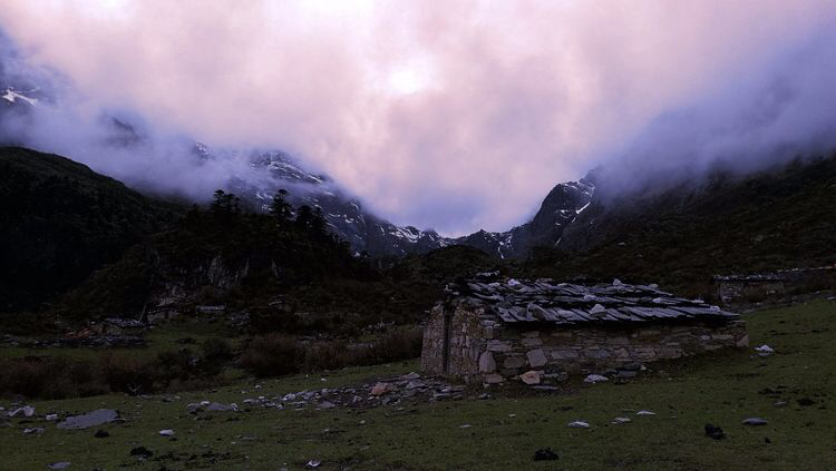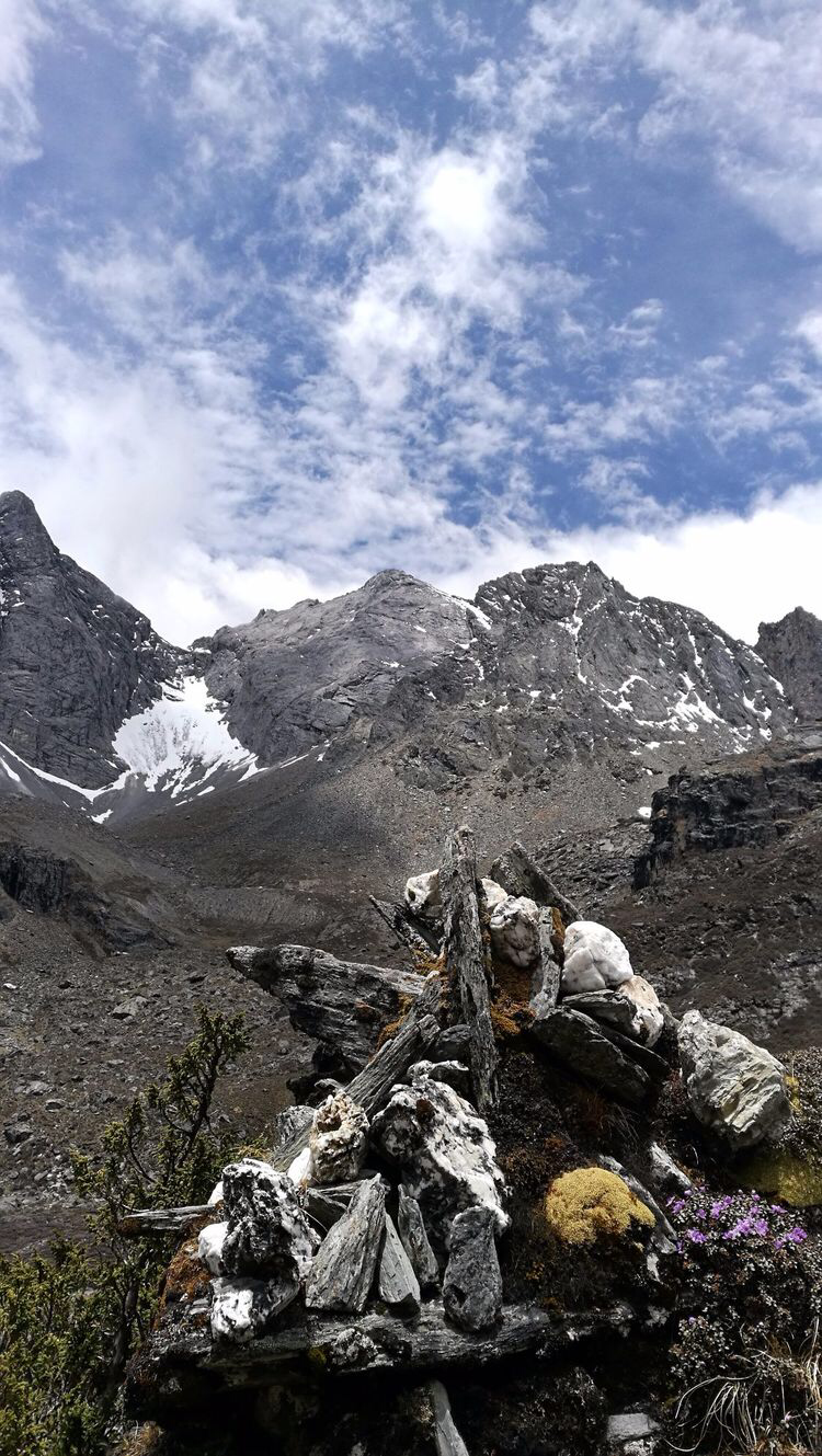 5.28.浑浑噩噩的一夜,似梦似醒。一夜的狂风暴雨,担心帐篷外帐都被刮跑。也有些寒冷,1200克睡袋里本来只穿了短裤热乎乎,不得已半夜起来加了速干内衣裤得以抵挡寒流。大雨时急时缓的敲打着帐篷布,远处大河涛涛声依旧,依稀有马脖子上驼铃的叮当声,一众荟聚在一起,倒好似一曲古琴《十面埋伏》。寒夜里睁眼盼天亮的感受。渐渐的,雨声小了,东方泛起鱼肚白。依稀听见不知名的鸟儿欢叫,马儿嘶鸣,天终于大亮。队友们一些人睡袋被帐篷内露水打湿,也有一些人被跳蚤蚊子袭扰身上红包片片,一部分人头痛,令人叫苦不迭。一个女队友出现轻微高反现象,虚脱恶心头痛,原有线路两座4700的垭口是万万不可能穿越了,一夜的暴雨必定使得积雪加深,贸然行进风险太大。同向导商议后决定改变线路,原来五天变四天,绕路到亚丁。一路的景色随着海拔下降,从高山草甸,巍峨雪山,渐变成冰渍湖遗留下的纯白色的石头河,耳畔不时传来远处震耳的雪崩隆隆声。在高山杜鹃花海中穿行久了,猛一抬头,眼前夏诺多杰雪山的错落雪层中,因为连日下雨行成错落有致的瀑布,从高处层峦起伏的倾泻到冰层上,产生巨大的轰鸣声。再往前行,一片广阔的松柏林,悬挂满垂吊着的树松,雾气中像似电影阿凡达的传奇场景。时常可见一颗几人合抱粗的大树横亘倒伏,横断面的年轮多到不可细数。
