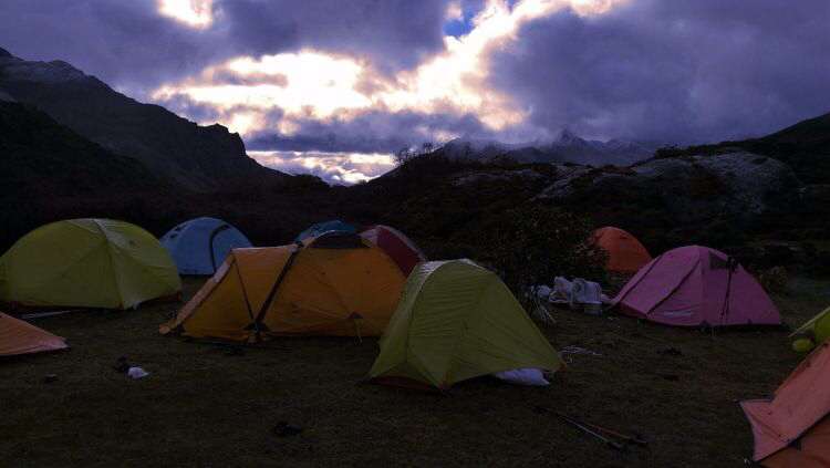 5.27.浑身湿冷躺在避风的帐篷里,喝着热咖啡,听雨滴噼噼啪啪敲打。回忆跨越回到早上。帐篷前的仰视90度的峭壁被薄雾笼罩,洗漱早饭,打包拔营,初始几个小时顺利,后来阴雨连绵,湿冷异常,雨披雨衣抵挡住雨水,但丝毫抵御不了寒冷。披荆斩棘,低头一味走路,队伍分散成几只,终于抵达营地。抓紧时间雨中扎营。雨水忽然变成了冰雹,淋漓敲打在绿色的草地上,撒满了白色的点点花朵。几组前面撤下来人路过,精神萎顿,有一男一女严重高反,呼吸困难,走路艰难,另外一队的人说翻过垭口遇到几年不遇的大雪,马匹根本通过不了。还拍了照片让我们看气候的恶劣。情况的严重。一致决定先扎营再说。这个营地只有浅浅十几公分的水洼作为饮用水。雨中四个人负责拉雨披遮挡雨水,下面炒菜做饭。马夫们安顿马匹,砍树烧篝火,一群人围着火堆聊天,寒暄。扎西唱起那动情的康巴情歌,大家举杯而和,欢笑洋溢在每一个人的脸上。一碗热乎乎的东北大烩菜,各种蔬菜,肉罐头掺合在一起,煮熟之后那香气已经让人有把那口锅端起来一饮而尽的想法。身体暖和了,在大珠小珠落玉盘的雨水敲打帐篷的音乐中幸福的睡去