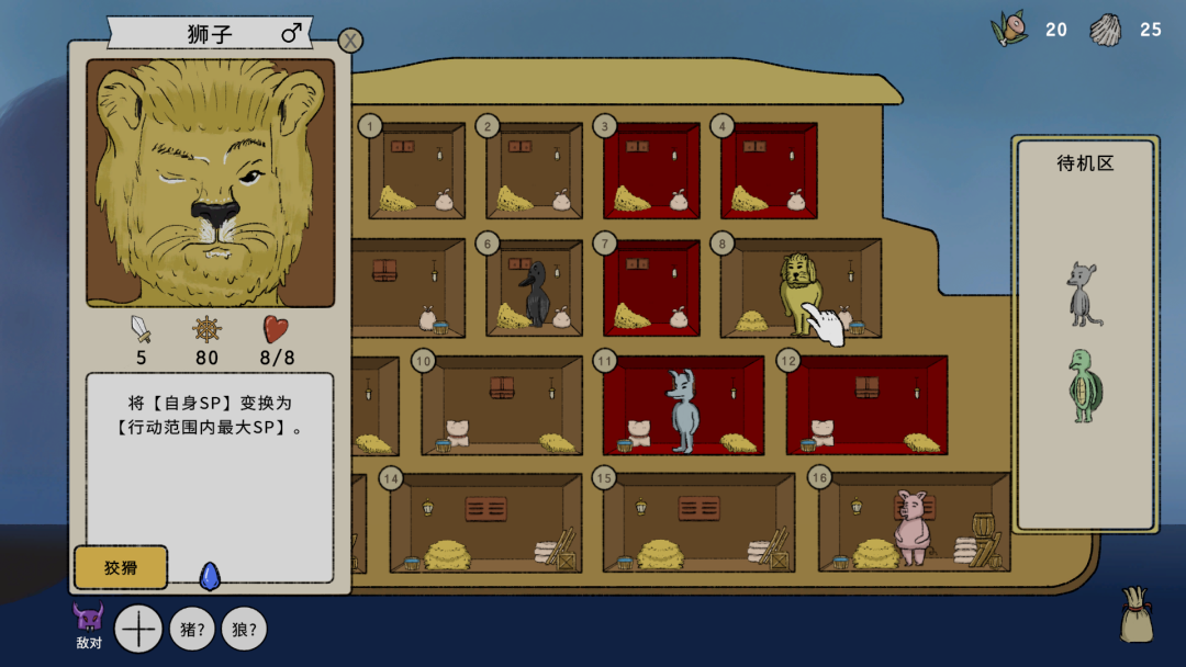 《诺亚》的第一个原型完成于2021年4月,当时的设计与数独原本的规则仍然非常接近。简单来说,就是每个动物都有自己讨厌的物种,当讨厌的物种住在其附近的房间里时,它们就会在夜间互相攻击,而玩家需要通过推理和移动动物来找出一版没有冲突的正确配置。做完这个最初的原型,大概用了四天,第一次试玩后,房间里响起了我的苦笑——这游戏实在太难了。