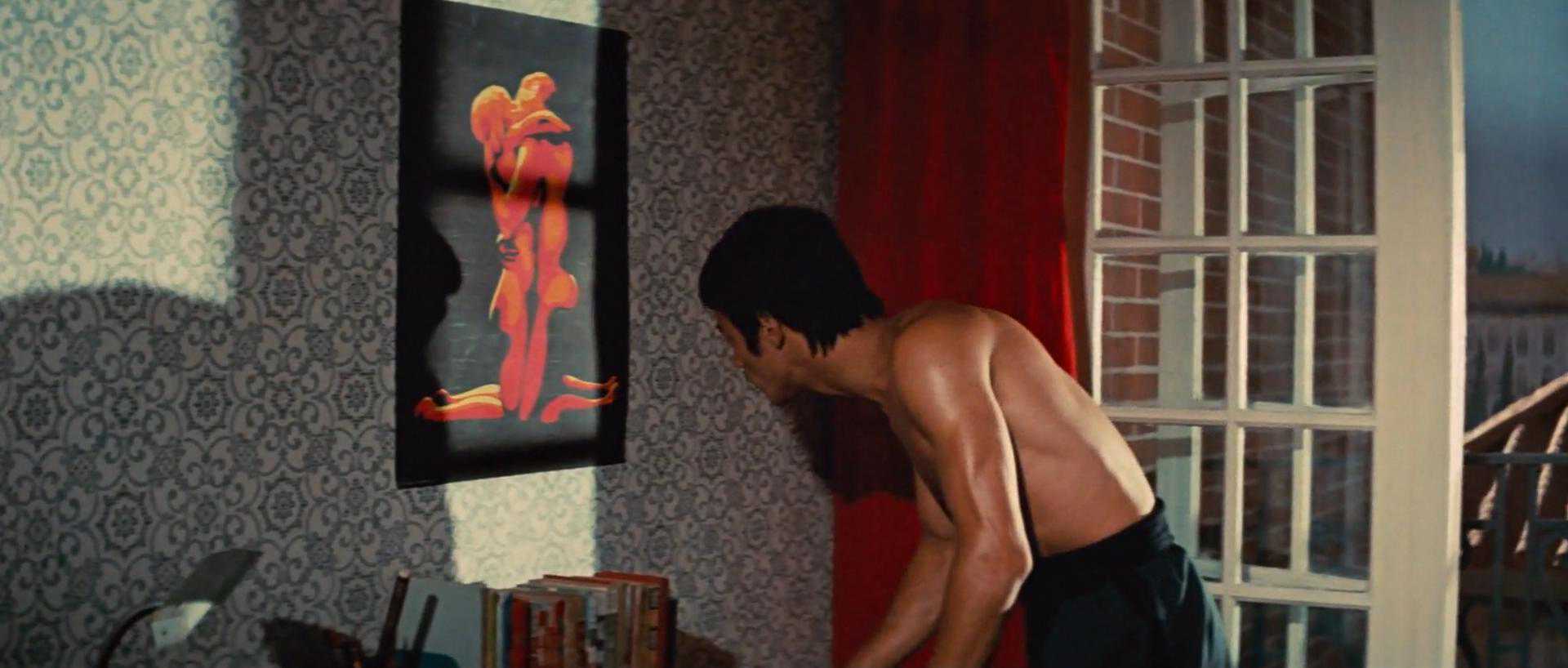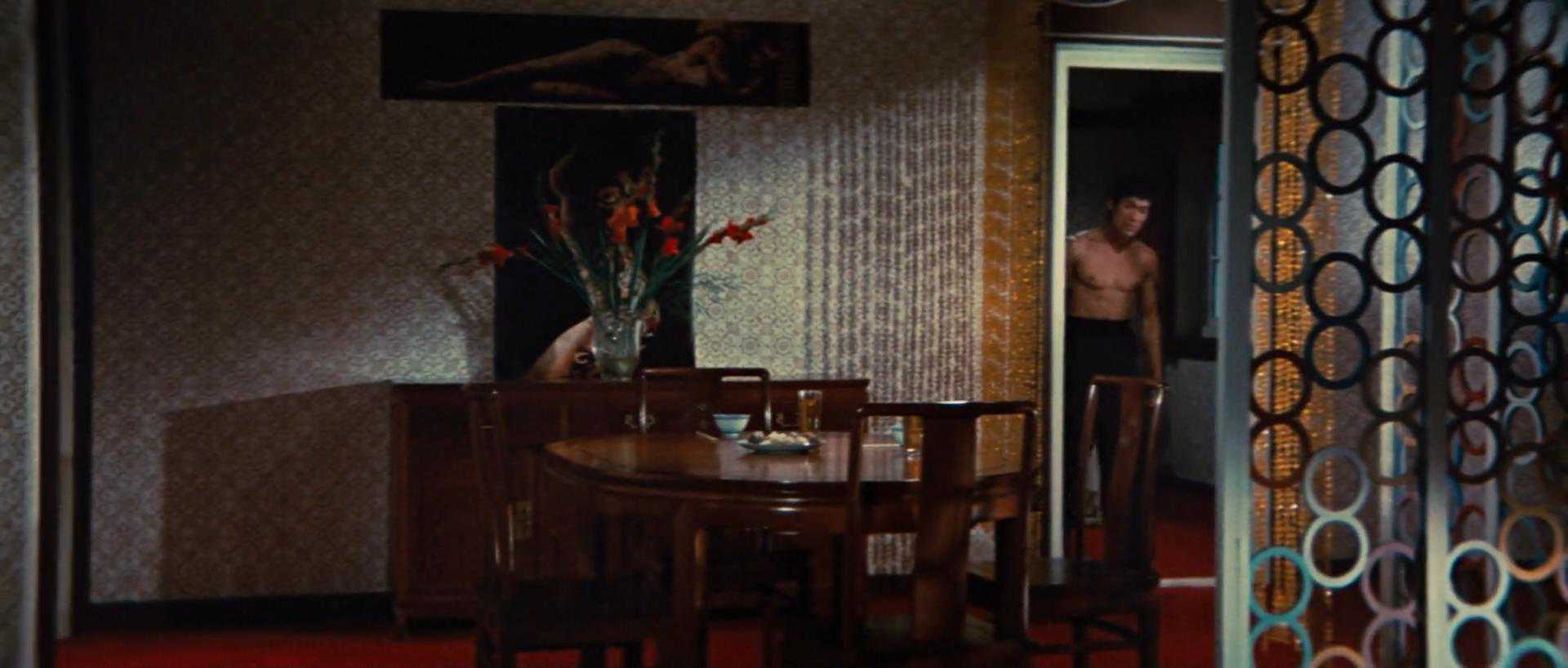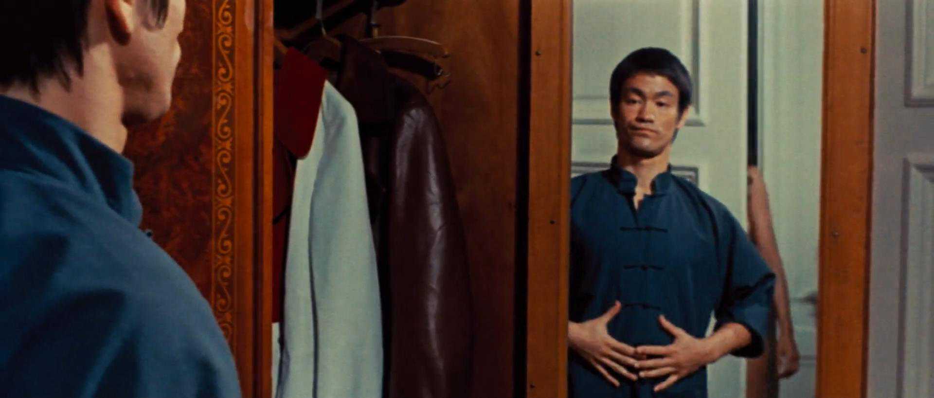 色彩鲜明,对比强烈,李的民族气节太耀眼了。李小龙的所有动作电影中,都对着装很重视,也不是什么高雅的唐装汉服,就是时下寻常的中华服饰。这份民族自信力,在朴素的着装中尤为凸显。