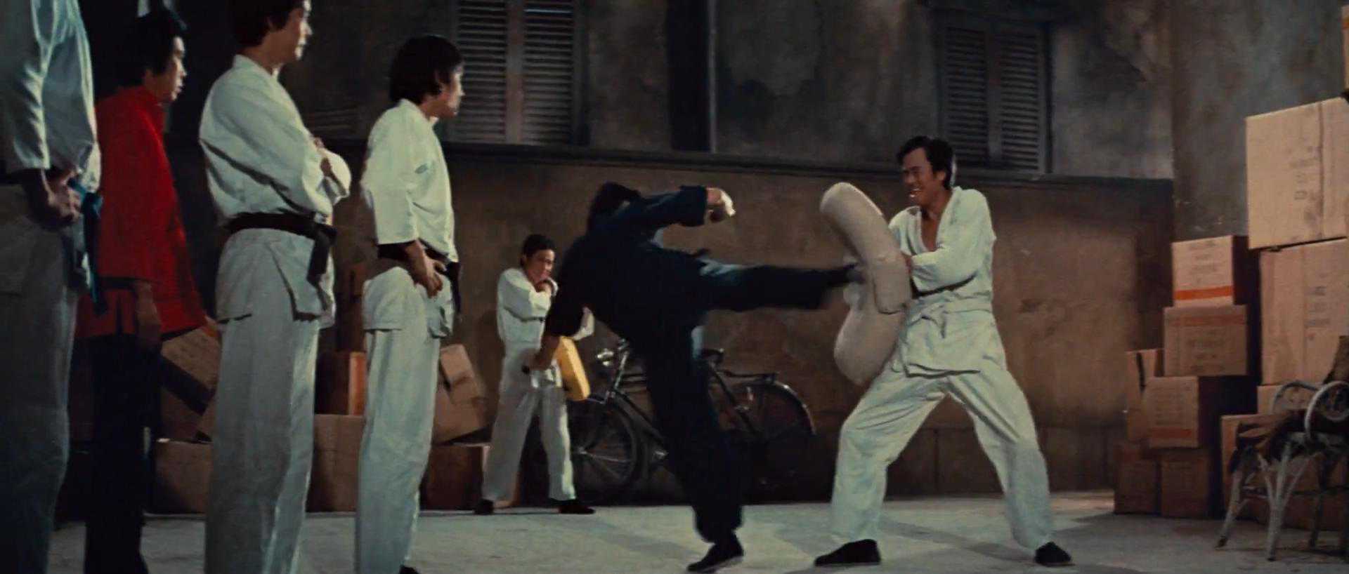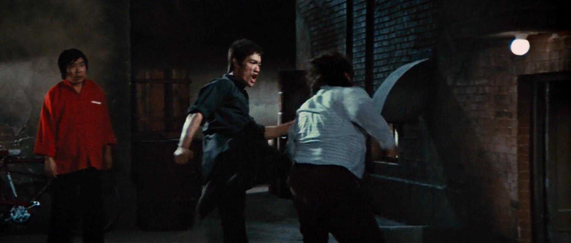 面对只会王八拳的搏击白痴,踢击是最有效的打击手段(一是攻击距离更长;二是维持下盘稳定就让普通人速率很低了,面对李的高速回旋踢无从反应)。一记回旋踢,高踢扫脸,结束与路人甲的搏斗。