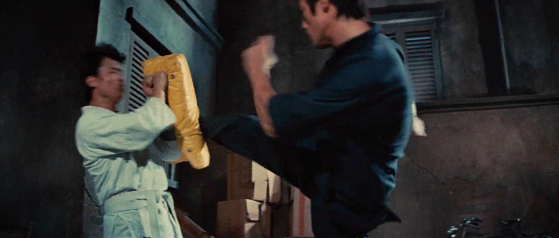 这一场景展示了两种腿法,尤其是侧踢。俯冲惯性势+稍向上踢=最强侧踢,这里的稍向上踢非常难,而且训练的难度系数也非常大。但是用“最难帧法”训练,便可以循习渐进,李小龙已经给我们展示了: