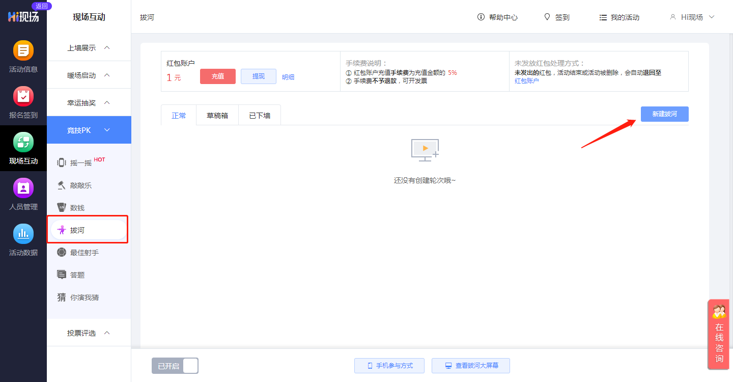 进入互动功能设置,选择“拔河”进行相关设置