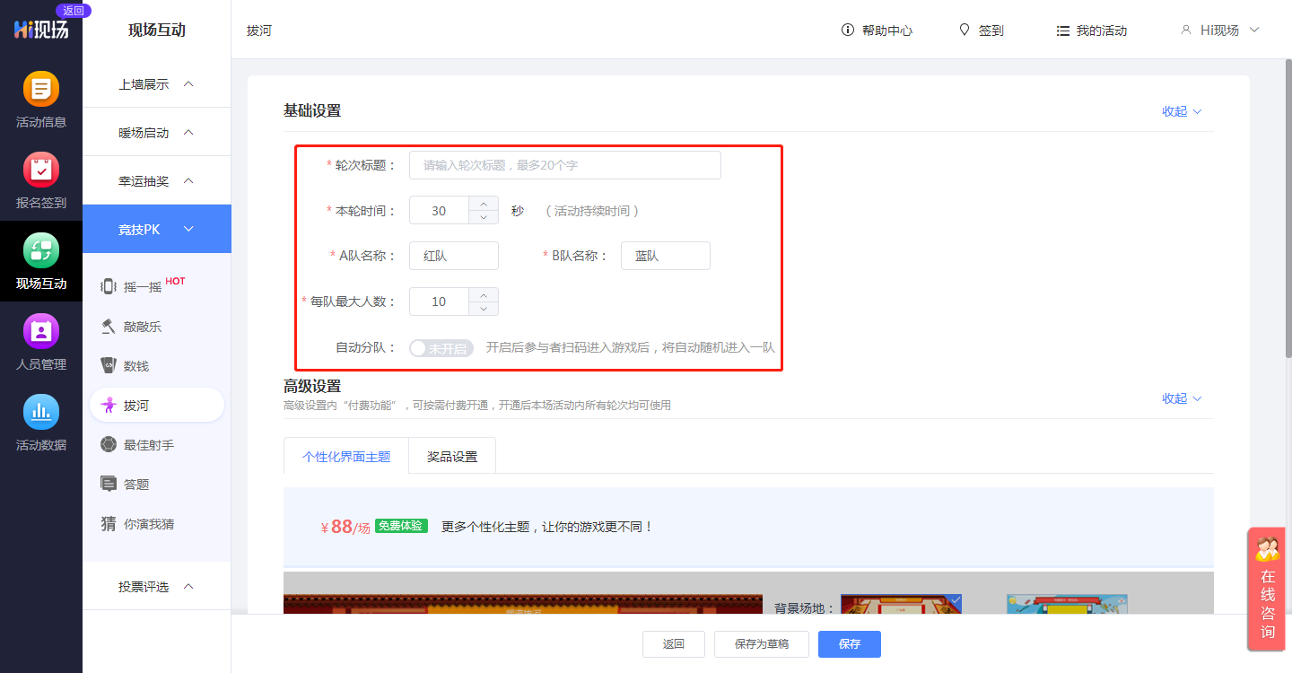 (1)基础设置:轮次标题、本轮时间、队伍名称、最大参与人数等