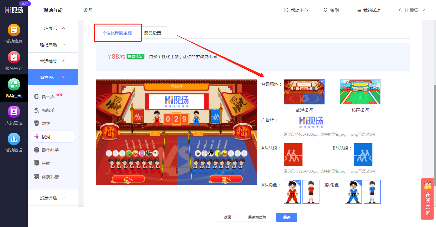 Hi现场系统互动游戏制作流程也超级简单,下面以拔河为例子,给大家演示一下:
