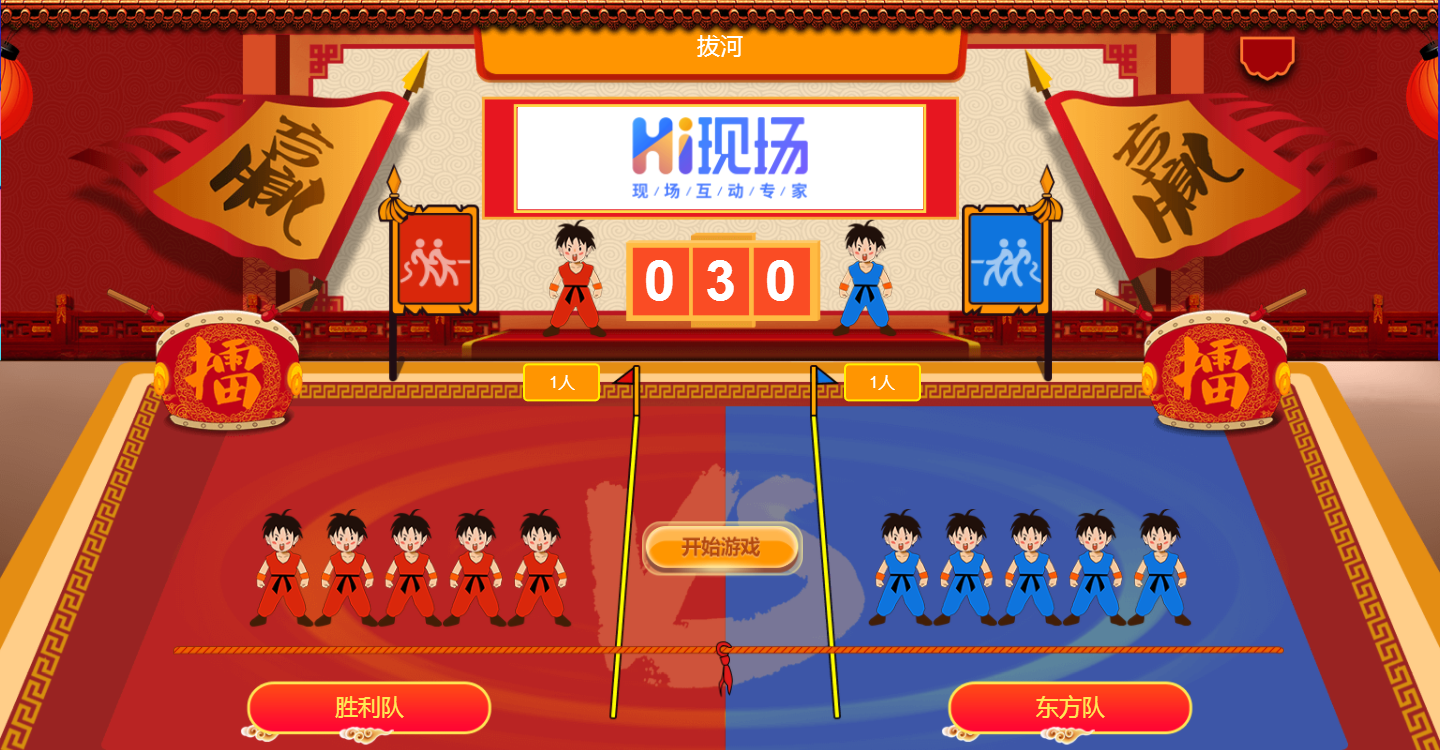 拔河是非常受欢迎的团队PK互动小游戏,用户扫码进入红蓝两边队伍,在开始后通过不断的摇动手机,大屏幕上显示两方拉锯的场景。有利于增加团队的默契和集体荣誉感,,团队与团队之间的PK也极大的增加了游戏的乐趣。拔河游戏在平台上非常的火爆,受很多企业和商家的追捧。